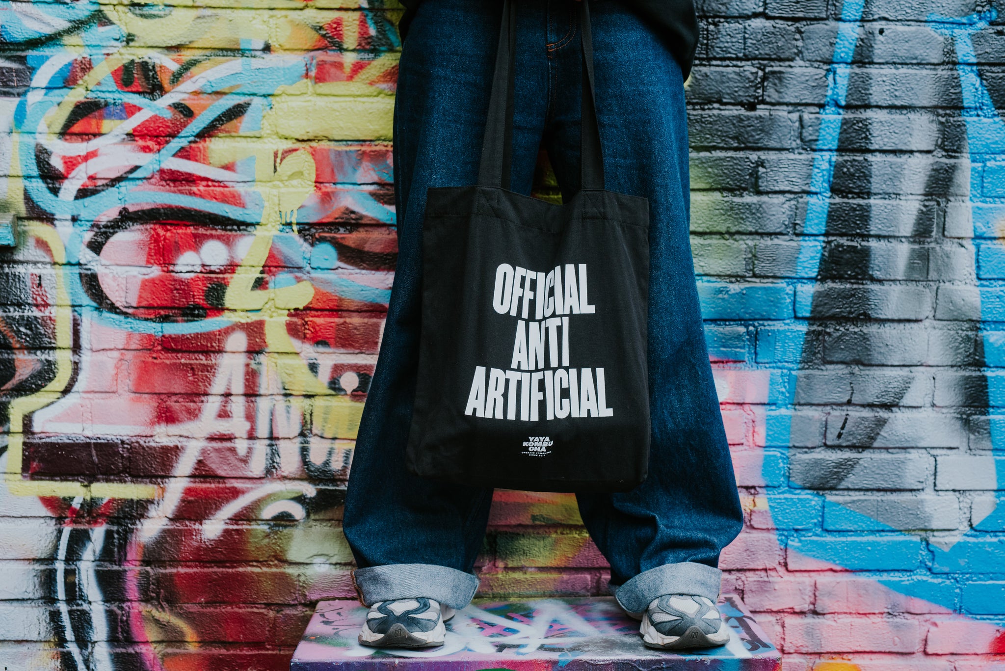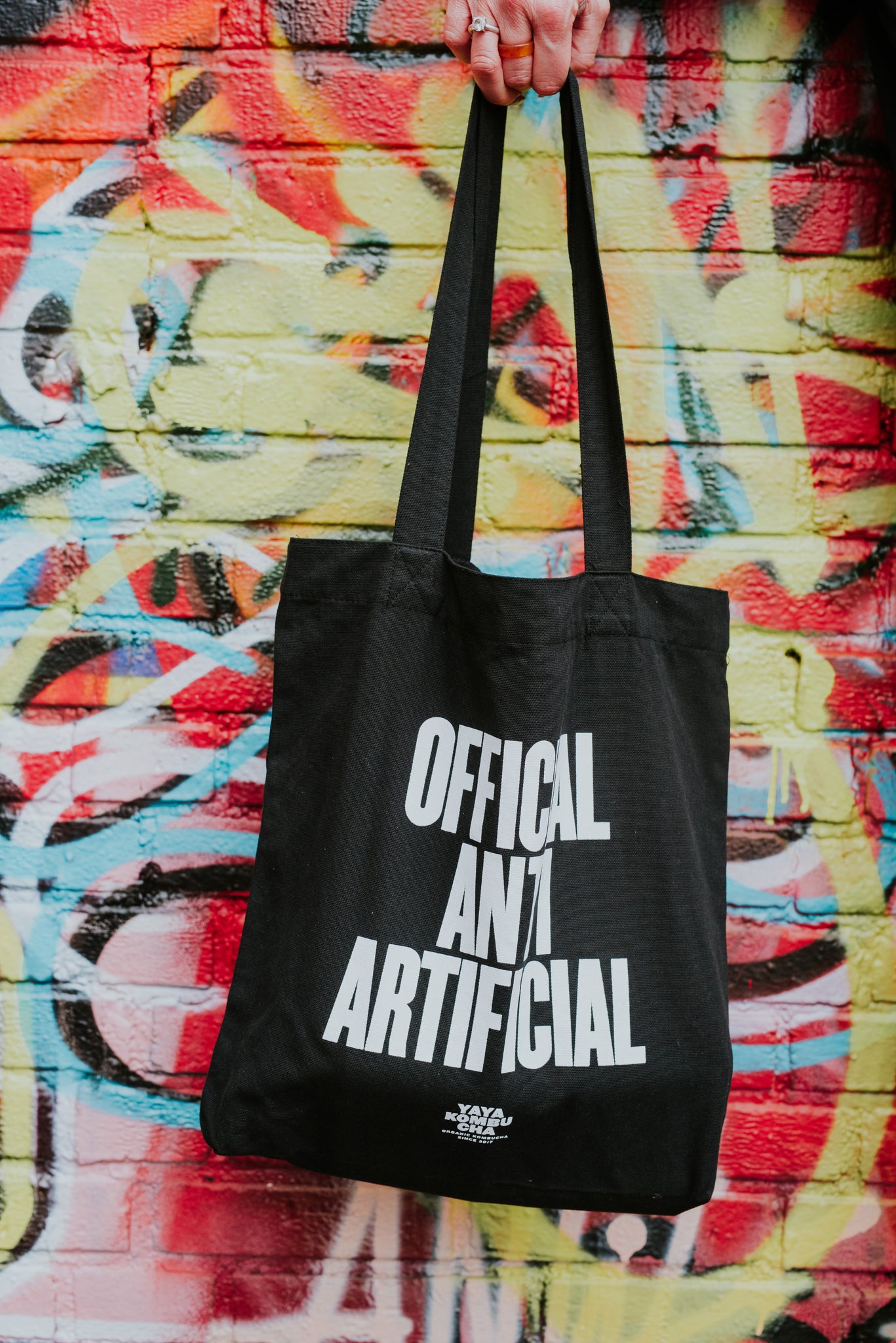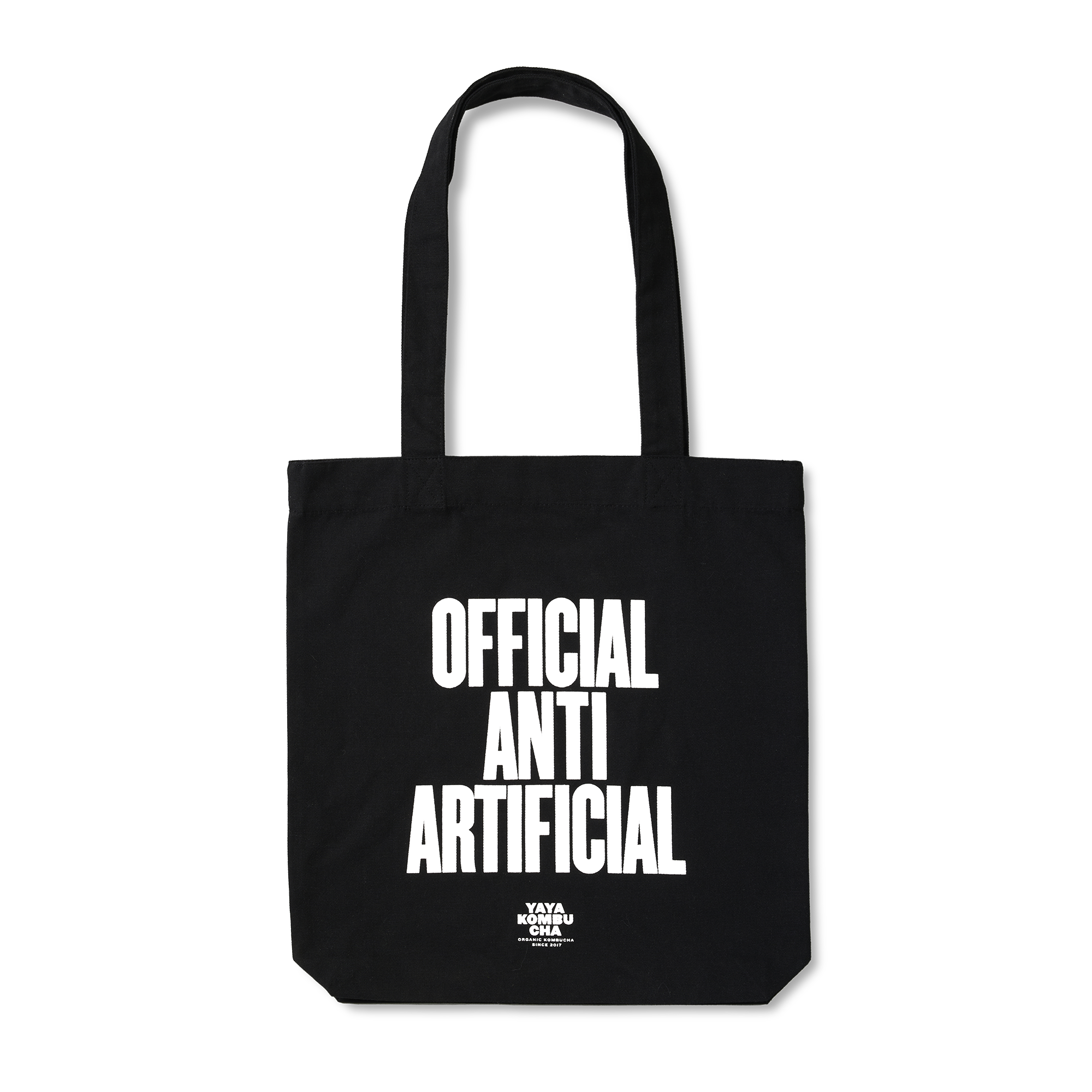 A black tote bag with the statement “official anti artificial”. Perfect for groceries, daily essentials, or your next YAYA kombucha run. Durable, reusable, and unapologetically anti-artificial.